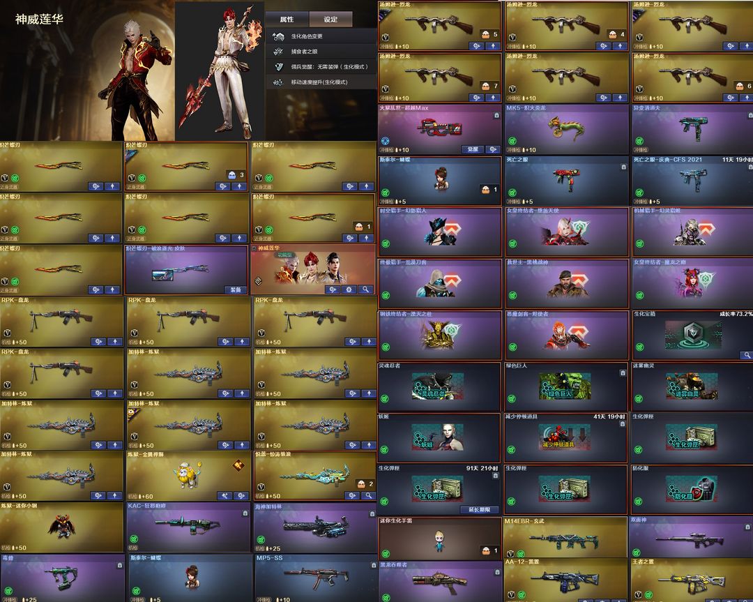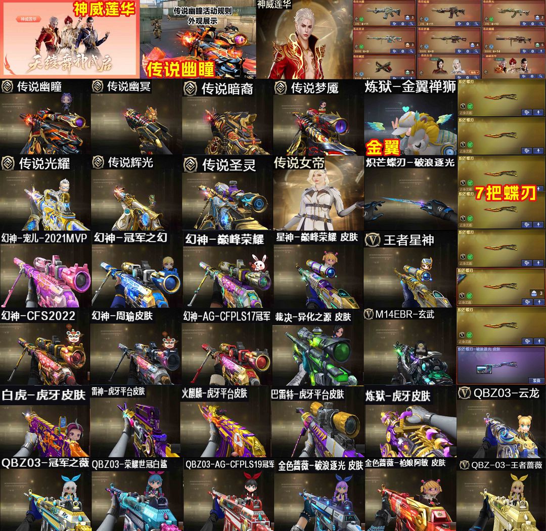 限制: 租号6次及以上 |装备描述:【装备道具】:神威莲华四防★新狮金翼禅狮★7蝶刃★传说女帝★传说暗裔/传说辉光/传说光耀/传说圣灵/传说梦魇/传说幽瞳★传说幽冥★M200-幻神★幻神-宠儿幻神-冠军之幻/幻神-巅峰荣耀/幻神-AG-CFPLS17冠军/幻神-CFS2022★星神-巅峰荣耀★极光-高能霹雳★裁决-异化之源★巴雷特-虎牙★火麒麟-虎牙平台★雷神-虎牙平台★黑骑士-虎牙★炽芒蝶刃★金色蔷薇-破浪逐光★金色蔷薇-枪娘阿敏★白虎-虎牙皮肤★白虎-暗星/QBZ03-AG-CFPLS19冠军/QBZ03-荣耀世冠白鲨/QBZ03-冠军之薇/炼狱-虎牙★炽芒蝶刃-破浪逐光★屠龙-破浪逐光★极光音效卡★星神音效卡★幻神音效卡★黑骑士音效卡★金色蔷薇音效卡★白虎音效卡★毁灭音效卡★火麒麟音效卡★天罚音效卡★玄武音效卡★幻神-黄忠★王者星神-觉醒版★98K-星神★M14EBR-玄武★王者雷影★王者猛虎M4A1/马枪★迷你小钢/斯泰尔-蝴蝶/MK5-炽火炎龙★荒漠琉璃/雨棠/华/雨墨/机械姬/电竞教官-云悠悠/枪娘樱/鹰/王者炫/王者春★竞技荣光套装/荣耀世冠套装/网剧冠军套装/云龙套装破空枪刃-夜魔USP-雷暴冠军之特世冠