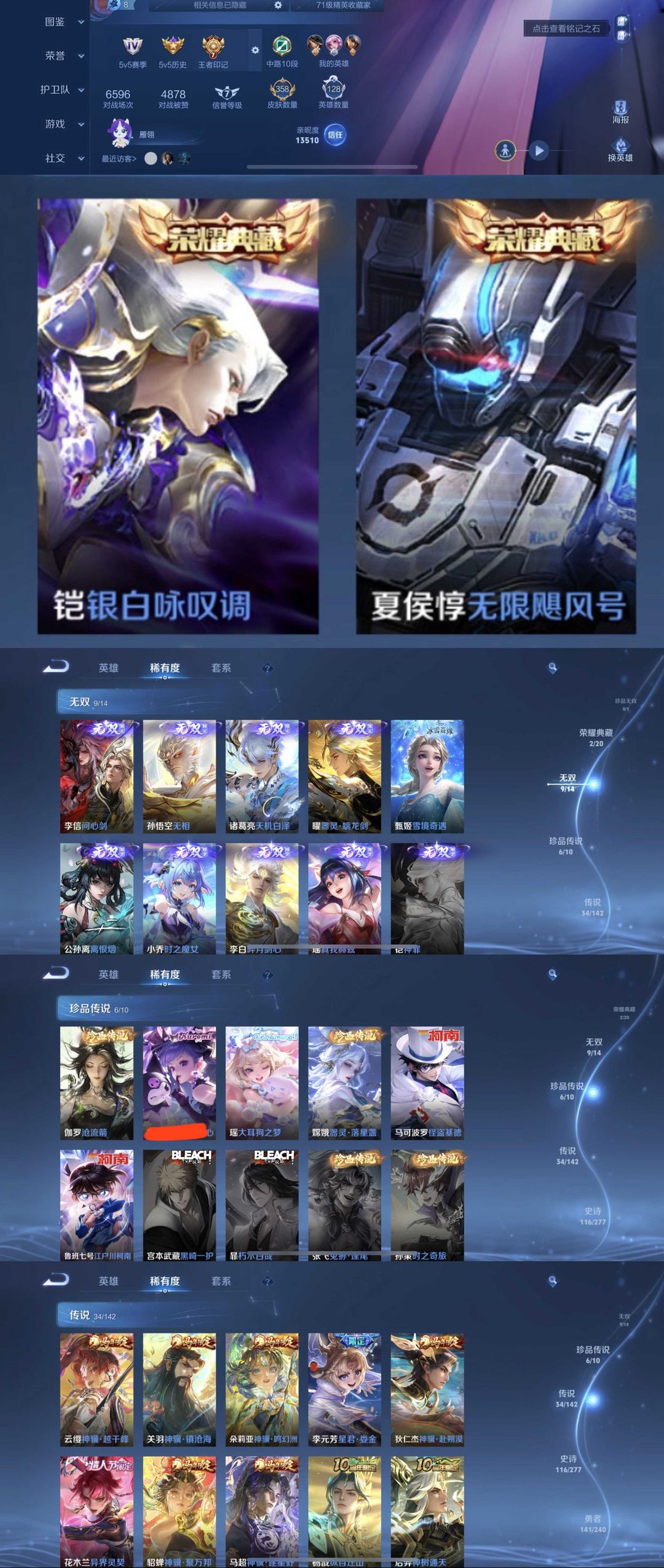 限制: 租号2次及以上 |装备描述:时间到了还登录白玩或者顶号全部改密拉黑处理永不解除,顶号机器会秒禁玩改密,顶号不仅拉黑还没得玩,赚三两块不容易,请理解谢谢。 ❤❤❤❤❤❤❤❤❤❤❤❤❤❤❤ 请勿开挂,挂机,送头,骂人,撤单后游戏等如有违规永久拉黑永不解除。 重置二级密码不要费劲了,号主每天都会上号查看,多行不义必自毙,人在做天在看,多做好事多自律,少做缺德事。 该号英雄130个皮肤358个,典藏2个,无双9个,珍品传说6个,星传说2个,传说34个,史诗116个,祝您游戏愉快~