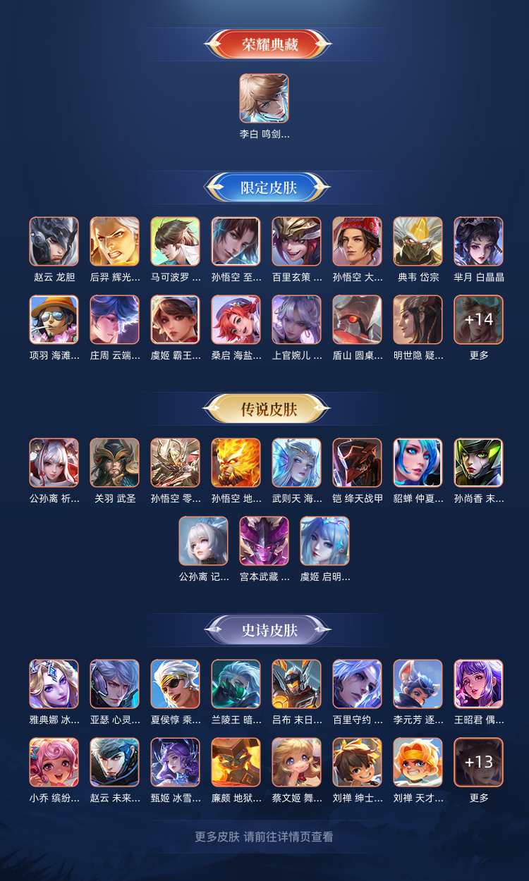 装备描述:贵族等级V10,英雄数量128,典藏皮肤数1,皮肤数量287,街头霸王至尊宝圣诞老人王者之锤热情桑巴逐梦之影大圣娶亲白虎志梁祝鸣剑·曳影龙胆武圣