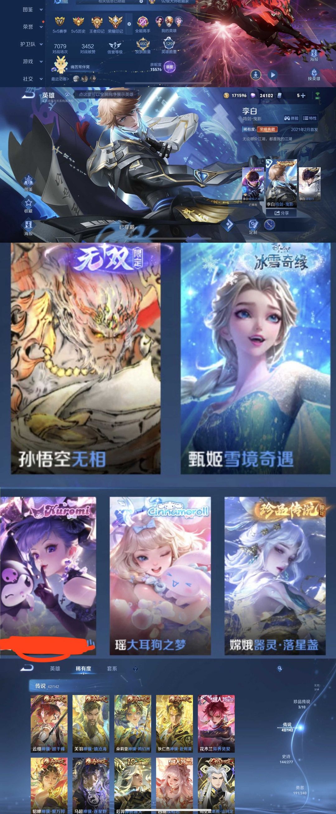 限制: 租号2次及以上 |装备描述:时间到了还登录白玩或者顶号全部改密拉黑处理永不解除,顶号机器会秒禁玩改密,顶号不仅拉黑还没得玩,赚三两块不容易,请理解谢谢。 ❤❤❤❤❤❤❤❤❤❤❤❤❤❤❤ 请勿开挂,挂机,送头,骂人,撤单后游戏等如有违规永久拉黑永不解除。 重置二级密码不要费劲了,号主每天都会上号查看,多行不义必自毙,人在做天在看,多做好事多自律,少做缺德事。 该号英雄129个皮肤460个,典藏1个,无双2个,珍品传说3个,星传说3个,传说42个,史诗144个,祝你游戏愉快~