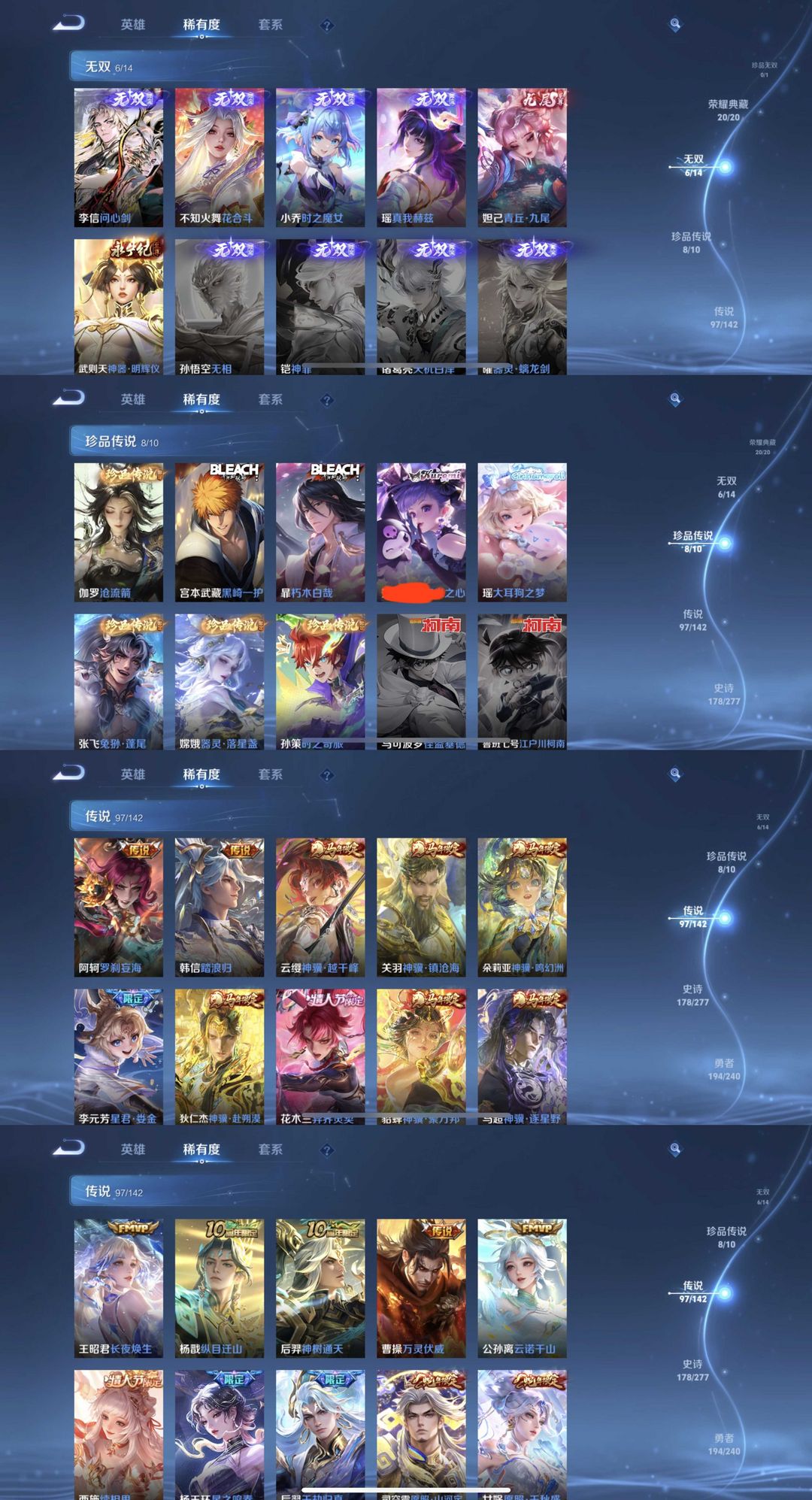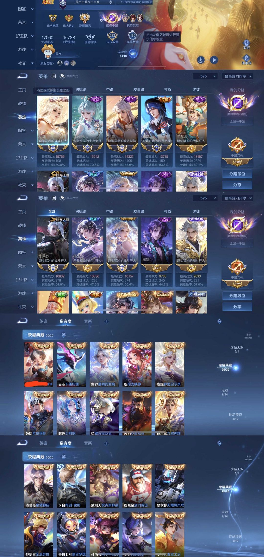 全典藏6无双8珍品✨75段中路✨历史千强中路✨国服貂蝉国服玩儿✨国服周瑜国服弈星✨罗刹妄海踏浪归魔镜
