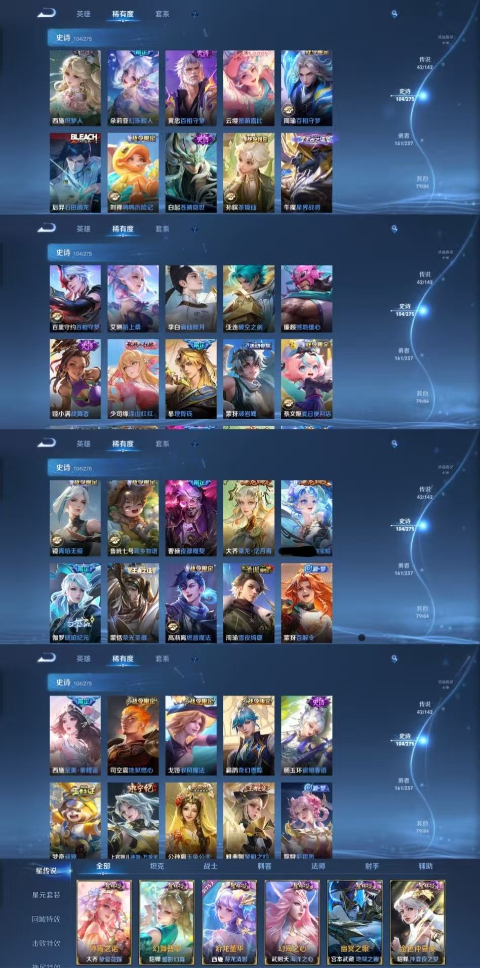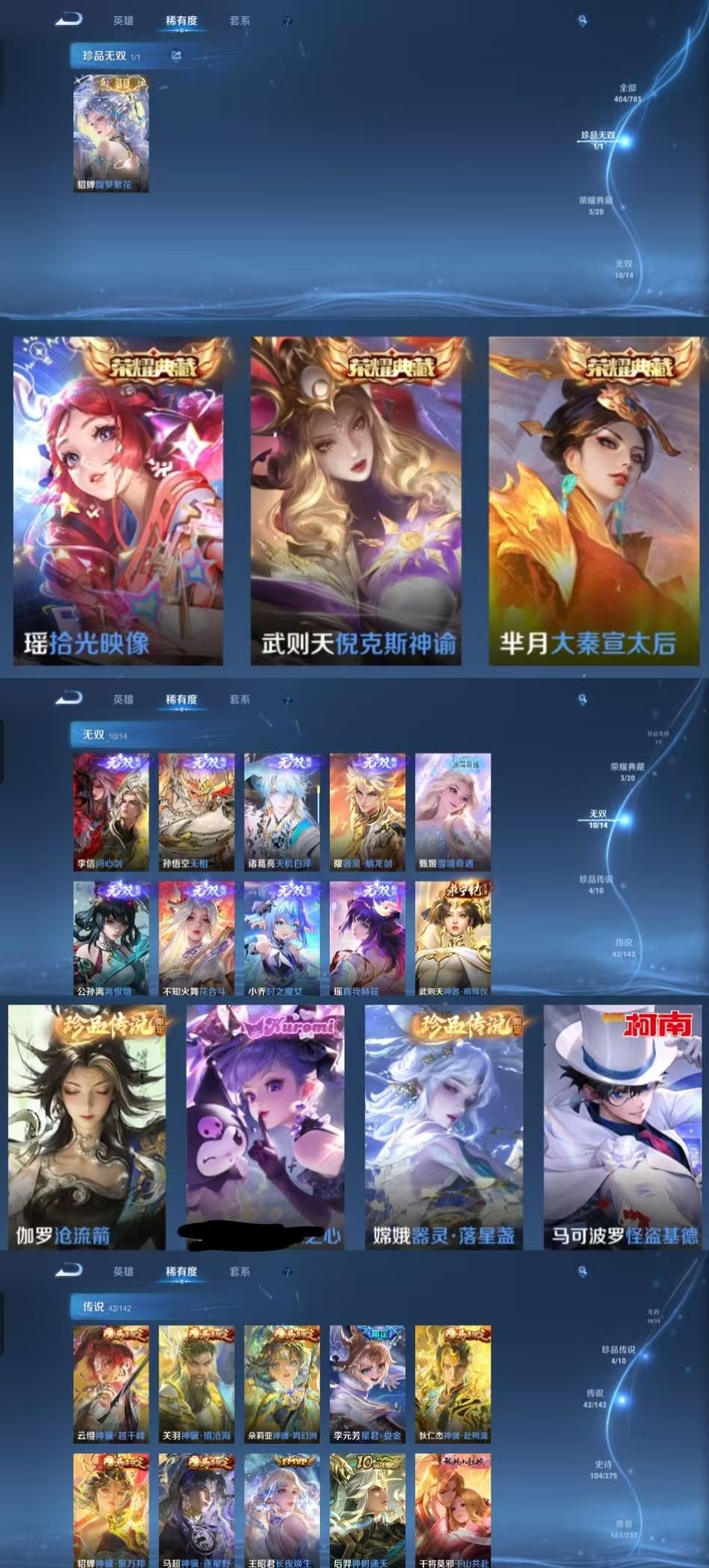 限制: 租号2次及以上 | 撤单率<49%才可租用此帐号装备描述:该号英雄129个皮肤404个,珍品无双1个,典藏4个,无双10个,珍品传说4个,星传说6个,传说42个,史诗104个,祝你游戏愉快~