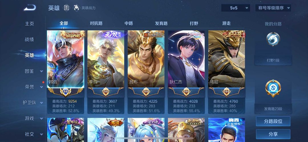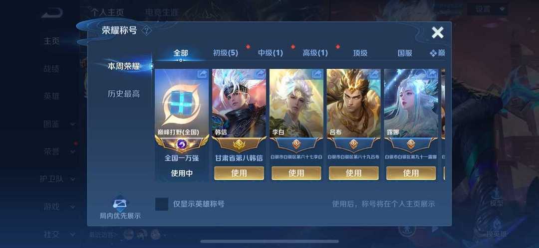 (禁玩巅峰赛)韩信省标在榜+打野万强,李白无双限定,韩信典藏,紫瑶,深海之息。历史韩信小国标。