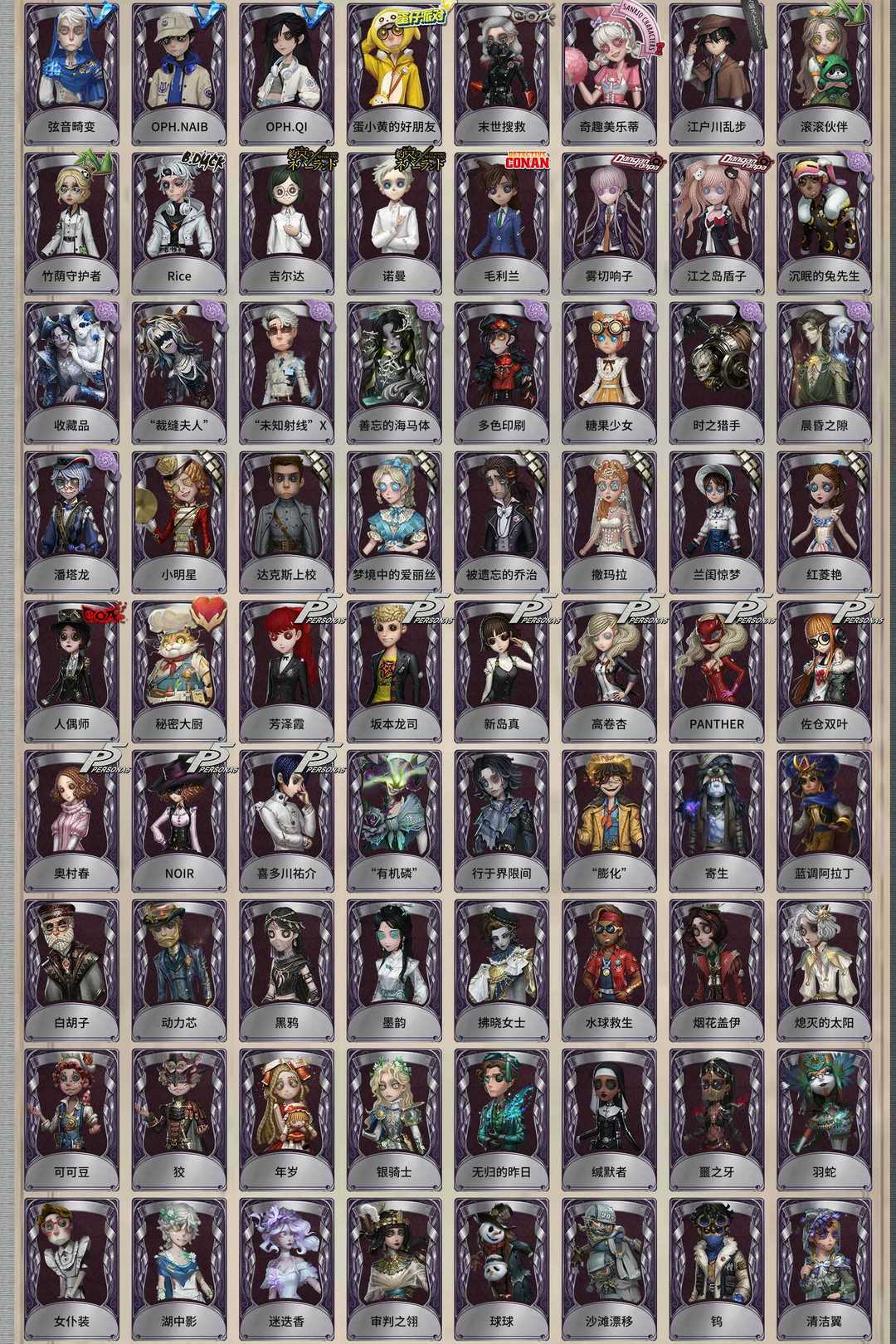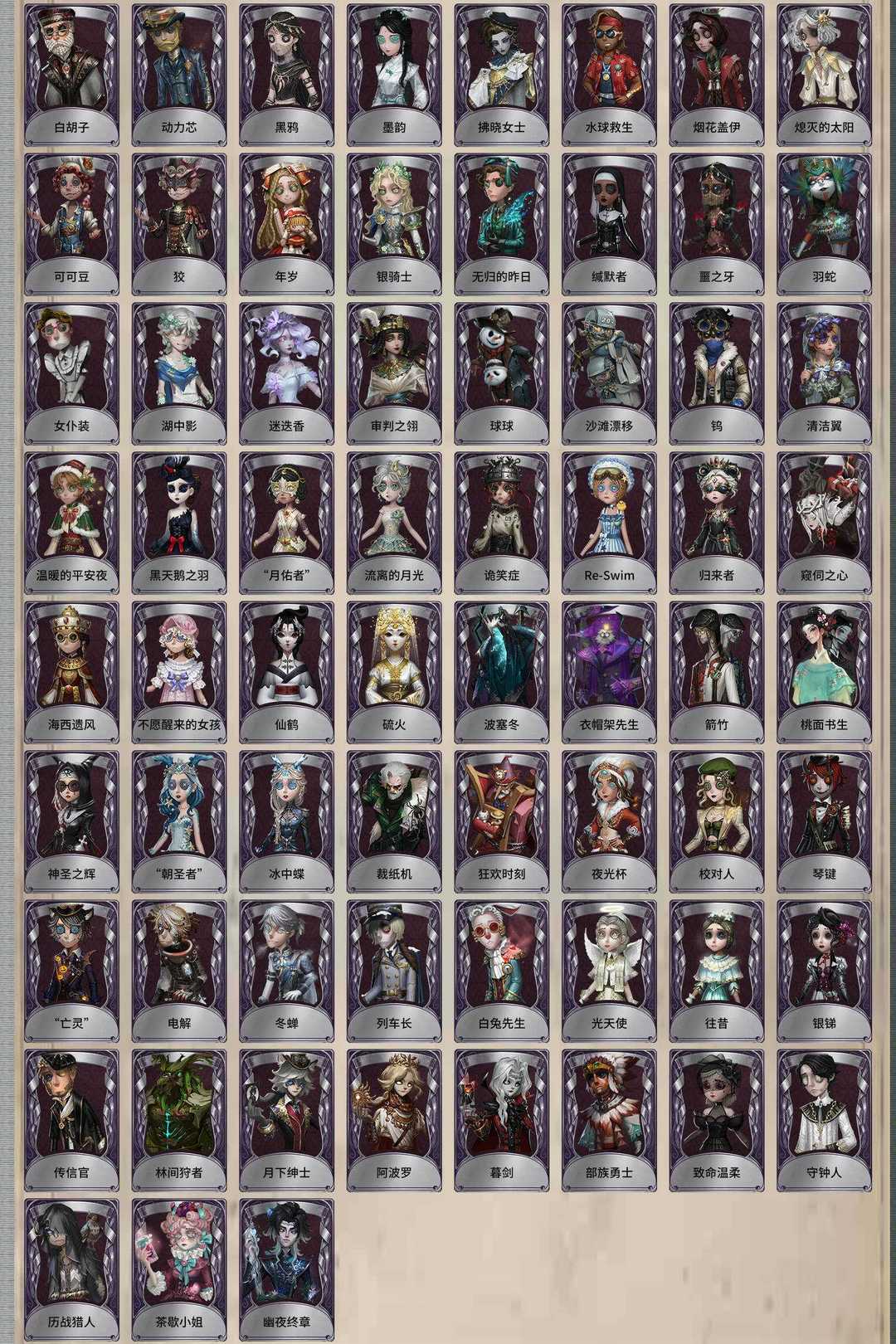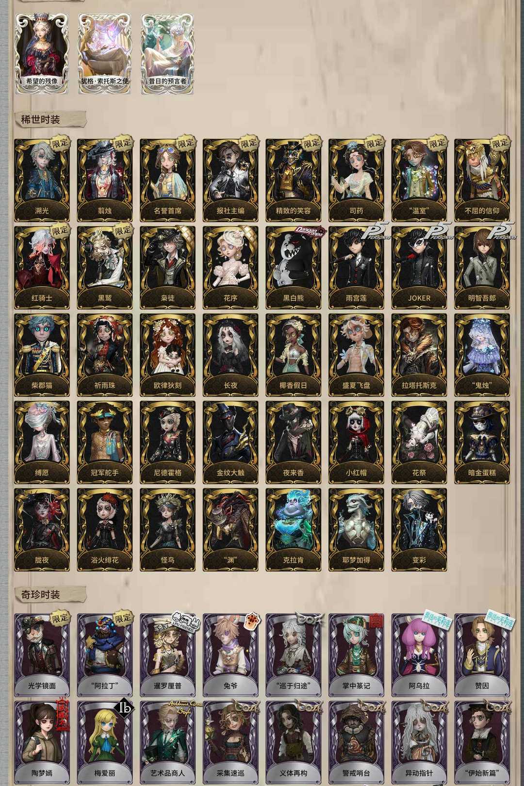 装备描述:犹格·索托斯之使 昔日的预言者 希望的残像 精致的笑容 司药 报社主编 翦烛 名誉首席 不屈的信仰 “温室” 溯光 红骑士 黑鹫 未至之人 雨宫莲 JOKER 明智吾郎 黑白熊 花序 枭徒 拉塔托斯克 浴火绯花 怪鸟 柴郡猫 金纹大触 夜来香 尼德霍格 小红帽 花祭 暗金蛋糕 胧夜 变彩 椰香假日 耶梦加得 盛夏飞盘 祈雨珠 “鬼烛” 缚愿 冠军舵手 长夜 欧律狄刻 克拉肯 “渊” 片刻闲暇 “阿拉丁” 光学镜面 奥村春 NOIR 新岛真 佐仓双叶 高卷杏 PANTHER 坂本龙司 喜多川祐介 芳泽霞 秘密大厨 人偶师 兰闺惊梦 达克斯上校 撒玛拉 红菱艳 被遗忘的乔治 梦境中的爱丽丝 小明星 “未知射线”X 糖果少女 沉眠的兔先生 时之猎手 晨昏之隙 “裁缝夫人” 潘塔龙 善忘的海马体 多色印刷 收藏品 雾切响子 江之岛盾子 毛利兰 吉尔达 诺曼 Rice 竹荫守护者 滚滚伙伴 江户川乱步 奇趣美乐蒂 末世搜救 蛋小黄的好朋友 弦音畸变 OPH.NAIB OPH.QI 异动指针 “伊始新篇” 警戒哨台 采集速巡 义体再构 艺术品商人 梅爱丽 陶梦嫣 赞因 阿乌拉 掌中篆记 “巡于归途” 兔爷 暹罗厘普 女仆装 光天使 往昔 银锑 白兔先生 传信官 林间狩者 蓝调阿拉丁 白胡子 动力芯 寄生 黑天鹅之羽 诡笑症 Re-Swim 归来者 “月佑者” 流离的月光 水球救生 窥伺之心 海西遗风 不愿醒来的女孩 仙鹤 硫火 波塞冬 衣帽架先生 箭竹 桃面书生 神圣之辉 “朝圣者” 冰中蝶 致命温柔 部族勇士 月下绅士 阿波罗 暮剑 历战猎人 守钟人 羽蛇 缄默者 噩之牙 可可豆 狡 夜光杯 校对人 琴键 “亡灵” 列车长 电解 冬蝉 球球 沙滩漂移 温暖的平安夜 裁纸机 狂欢时刻 钨 清洁翼 湖中影 迷迭香 审判之翎 银骑士 年岁 无归的昨日 烟花盖伊 熄灭的太阳 黑鸦 墨韵 拂晓女士 行于界限间 “有机磷” “膨化” 茶歇小姐 幽夜终章